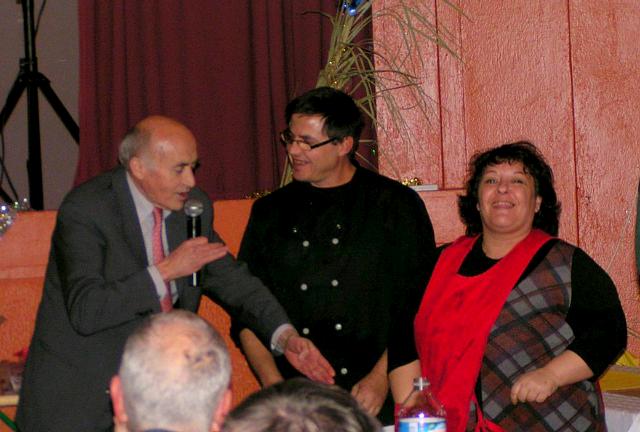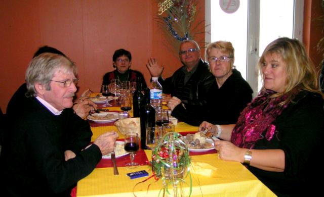 Gourmets et joyeux lurons nos Aînés Par ce vendredi 8 janvier, jour de neige,nos Aînés avaient osé braver la froidure pour assister au repas traditionnel des Anciens.150 convives avaient répondus à l'invitation de la municipalité.Dans un foyer joliment décoré et dans une agréable ambiance musicale réalisé par le groupe EN CATIMINI chacun avait plaisir à se retrouver. Le Premier Magistrat Guy Gout souhaita la bienvenue et renouvela ses vœux pour 2010. Après une rétrospective de l'année écoulée et après avoir eu une pensée pour nos aînés malades ou malheureusement disparus un apéritif amical fût offert. Le repas réalisé par le traiteur local et servi par les élus municipaux et quelques bénévoles répondit aux attentes de nos fins gourmets qui malgré les années ont toujours bon pieds bon œil et bon appétit .Quelqu'un osèrent quelques pas de danse sur la piste retrouvant un instant leurs jambes de 20 ans. Les sourires et la bonne humeur de chacun étant une preuve de la réussite de cette conviviale réunion. Bonne année , bonne santé et à l'an prochain