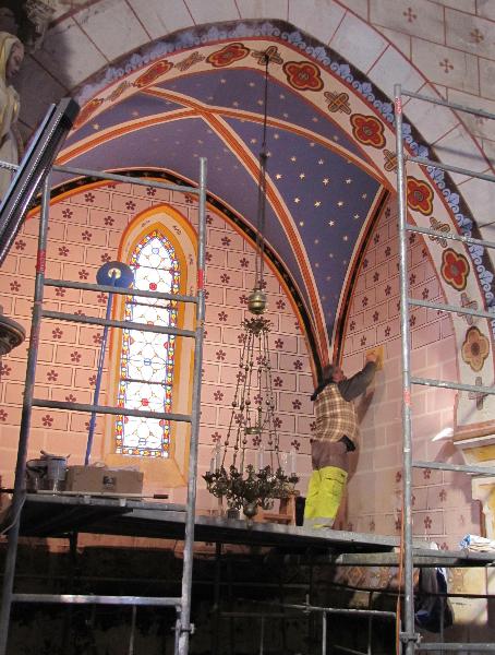 L'église Ste Eulalie est fin prête pour accueillir les fidèles pour la célébration de Pâques. Pendant plusieurs mois, Philippe a passé une grande partie de ses journées dans l'édifice afin de restaurer la chapelle St Joseph. Les travaux sont terminés et les fidèles pourront se rendre compte du résultat: un véritable travail d'orfèvre pour redessiner et peindre les centaines d'étoiles qui ornent la voûte céleste et de fleurs qui décorent les murs avec une dizaine de nuances de peintures à l'ancienne et une précision qui requiert une forte dose de patience. Cette restauration financée par Les Amis Thézanais du patrimoine sera suivie, dans la foulée, d'une cure de jouvence dans la chapelle Ste Germaine.