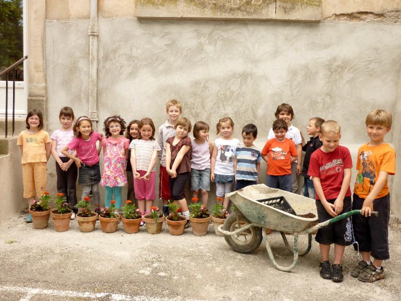 Des nouvelles fleurs pour l'école Un rayon de soleil dans cette semaine tristounette... La déception des enfants de maternelle grande section et CP était si grande après les dégradations de leurs plantations que les parents se sont unis pour offrir de nouvelles fleurs aux 18 élèves de la classe. Ainsi, vendredi après-midi, aidés par leur enseignante Laeticia Legoff et l'ASTSEM, Belinda, ils ont repris leurs outils ainsi que les pots de fleurs et la terre mis à disposition par la municipalité pour planter œillets d'Inde et bégonias - déjà bien fleuris. Chaque pot porte les initiales de son futur propriétaire car à la fin de l'année scolaire, chacun reprendra son bien pour en prendre soin jusqu'à la fin de la floraison.... comme ils devaient le faire avec les bulbes d'été.