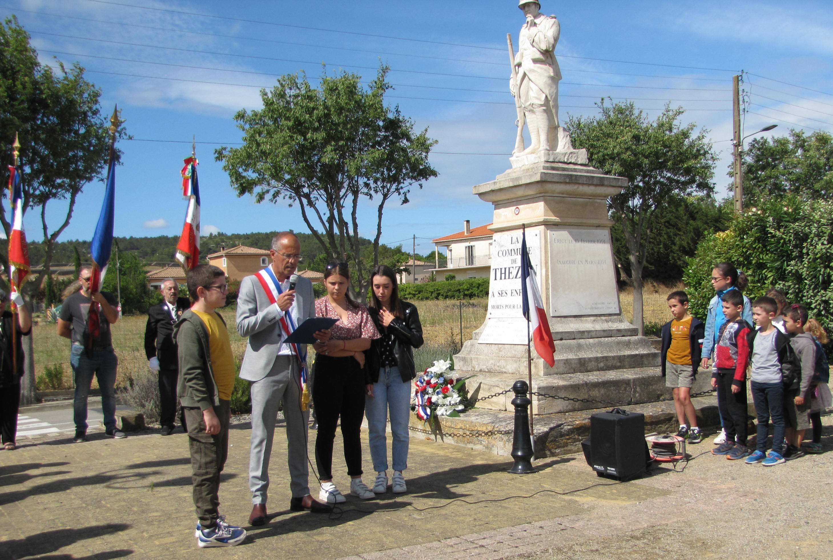 La cérémonie officielle du 14 juillet a rassemblé une trentaine de personnes autour du monument aux morts. Le maire Philippe Puech entouré des adjoints et de conseillers municipaux et le président des anciens combattants Guy Flamand ont confié aux enfants présents l'honneur de déposer la gerbe au pied du Monument aux morts. Après