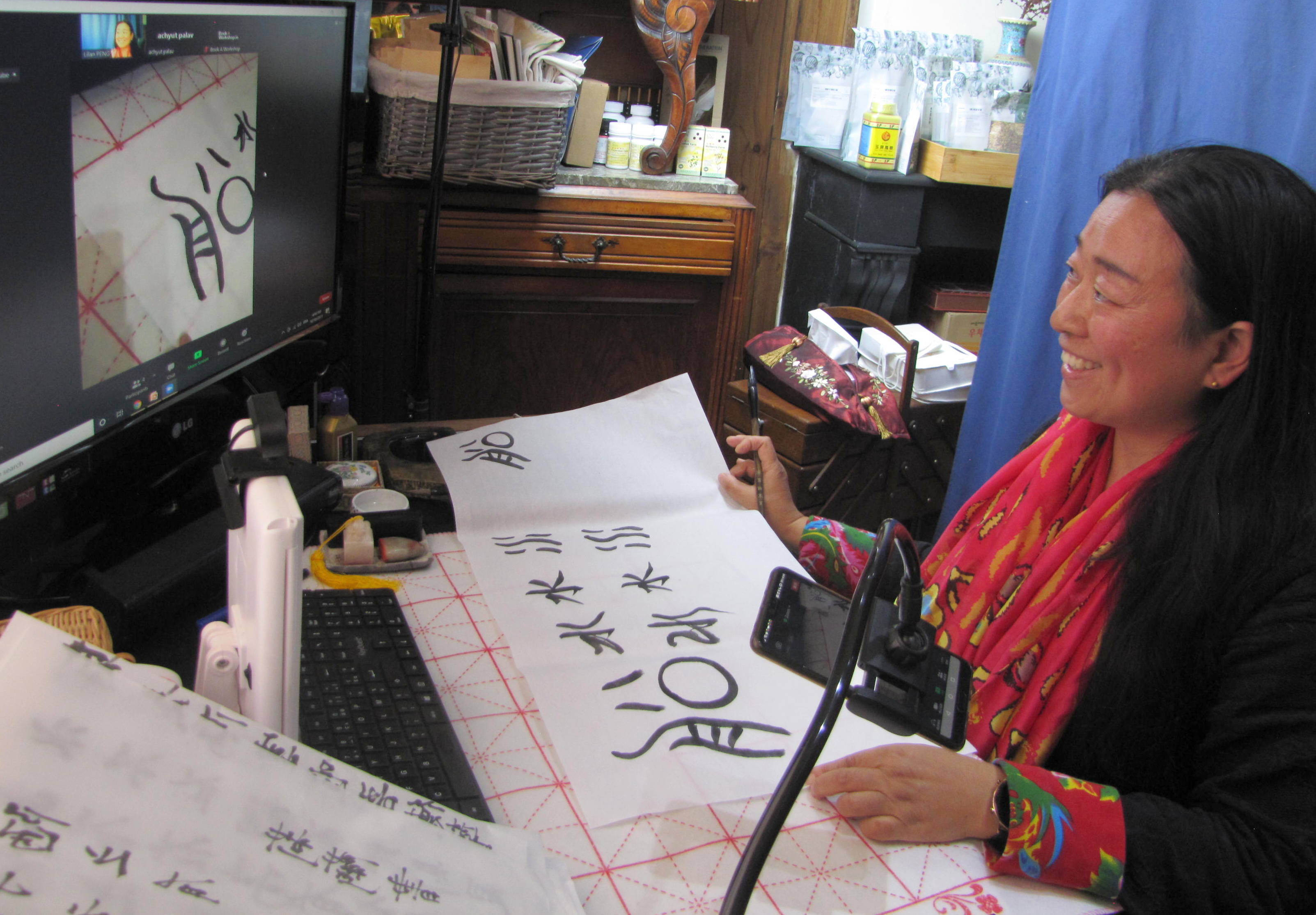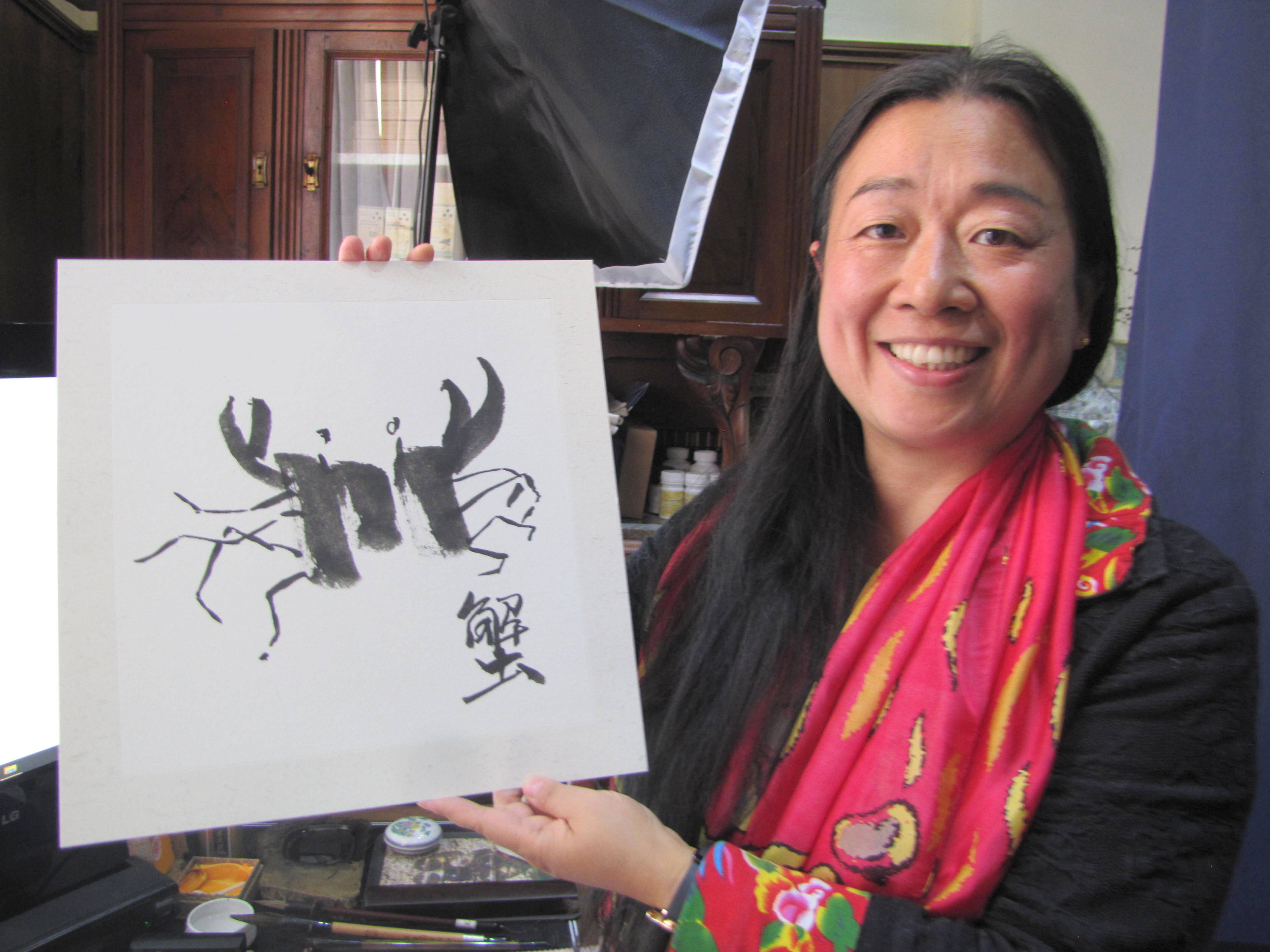 Lilan Peng présente le crabe, le dernier caractère de calligraphie effectué devant un millier d’internautes. |