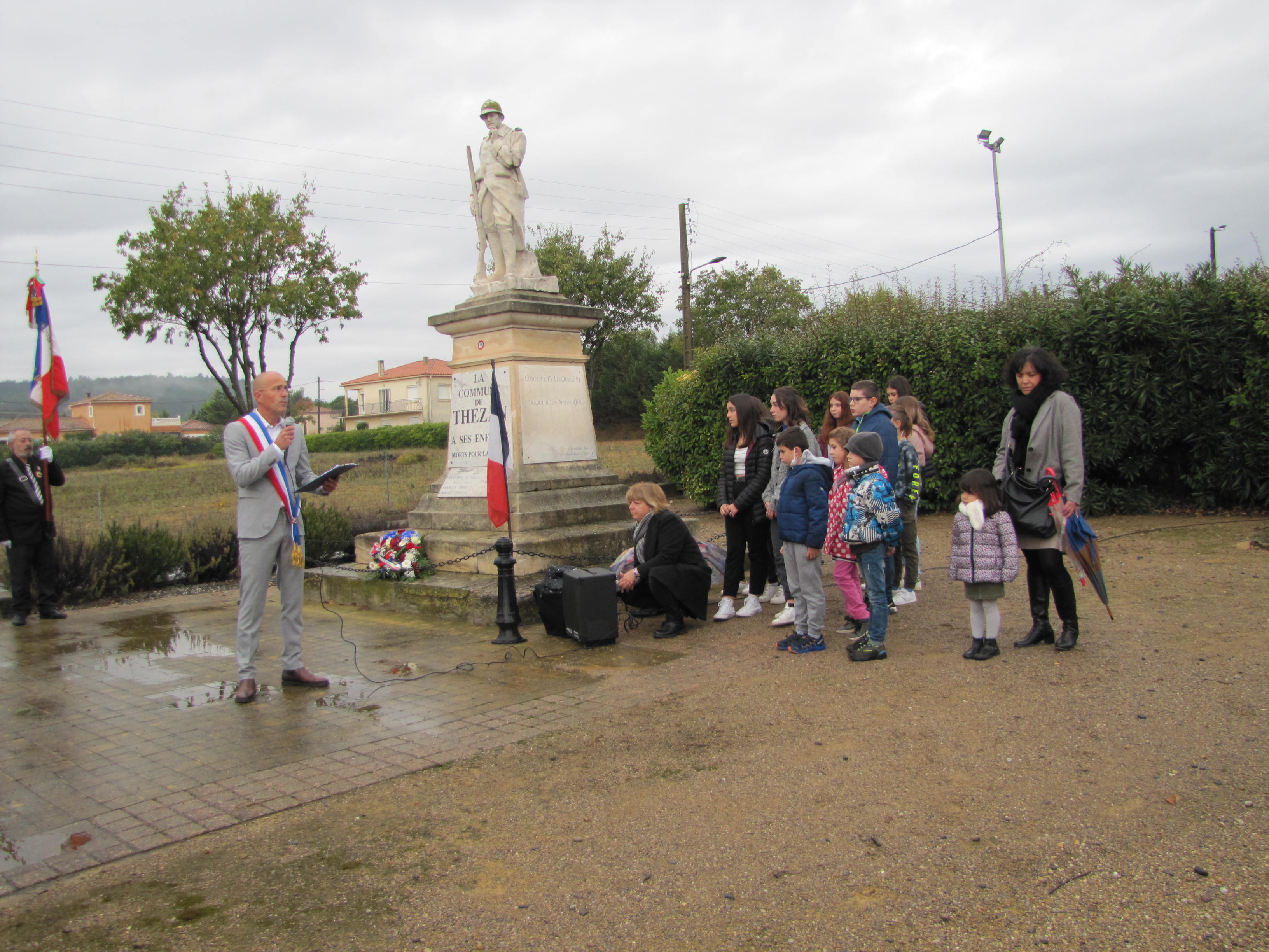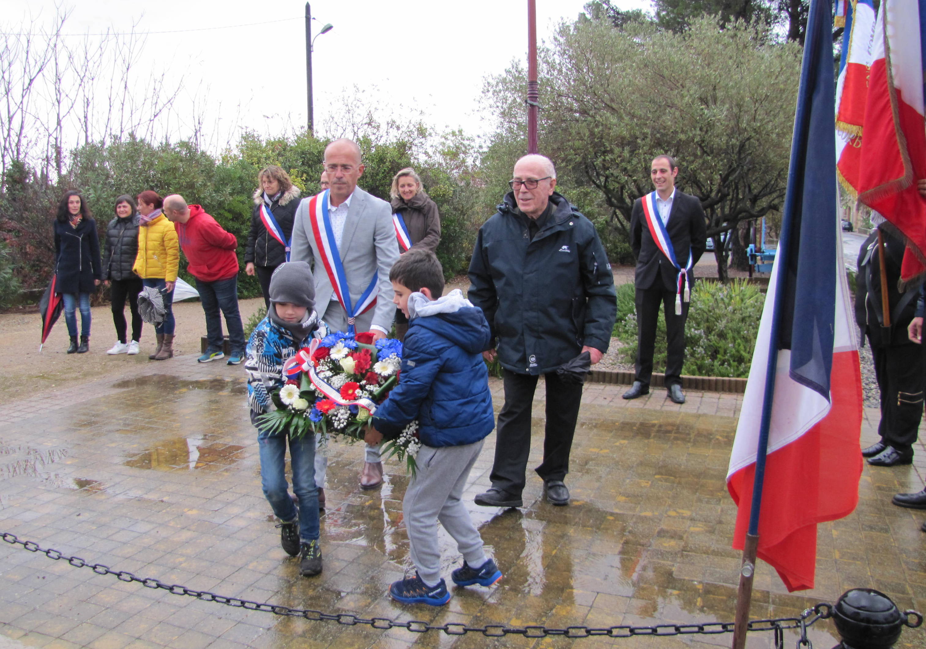 du 14 novembre 2021 Célébration intergénérationnelle pour célébrer l'Armistice Il y avait autant d'enfants que d'adultes autour du maire Philippe Puech et des élus pour commémorer la fin de la première guerre mondiale. Après le dépôt de gerbe par Loan et Marius aidés par le maire et Guy Flamand, président des anciens combattants, la Marseillaise et les sonneries d'usage, hommage a été rendu aux combattants de toutes les guerres. "La Nation salue la mémoire des soldats morts pour la France en 2021 en Egypte et au Mali. Aujourd’hui, dans un même mouvement, la France reconnaissante fait cortège au cercueil d’Hubert Germain jusqu’à la crypte du mémorial de la France combattante au Mont Valérien. Selon la volonté du général De Gaulle, l’ultime compagnon de la Libération y reposera...La flamme des compagnons s’est éteinte, mais nous sommes les dépositaires de ses braises ardentes." a souligné lé maire au travers du message de la ministre déléguée aux anciens combattants.