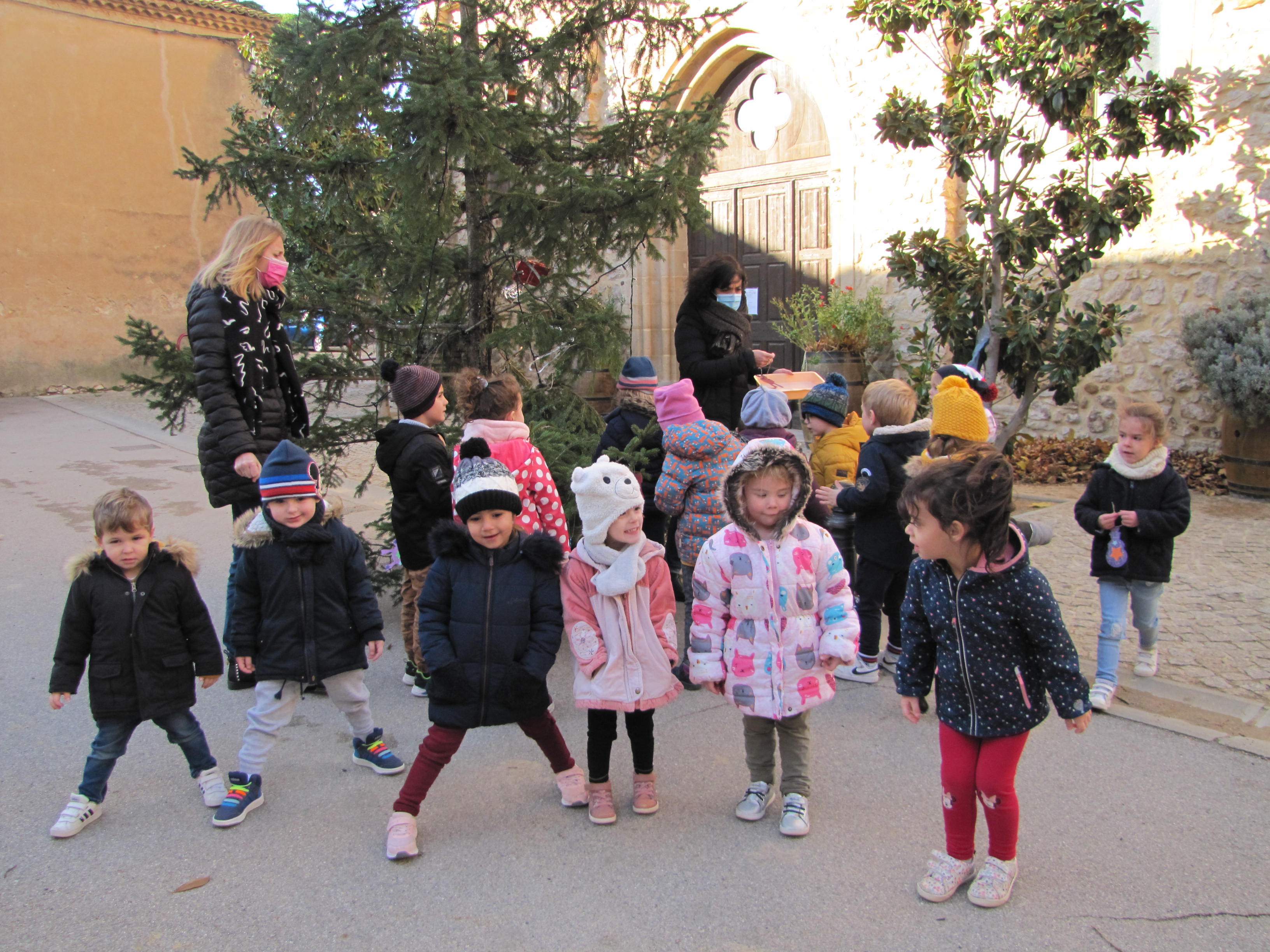du 10 décembre 2021 Les élèves de maternelle ont décoré le sapin Cette année encore un grand sapin offert par l'ONF, Office National des Forêts, a été installé place de la mairie. L'occasion était offerte aux jeunes élèves de petite et moyenne section de maternelle de démontrer leurs talents artistiques. Avec leur directrice Læticia Le Goff et Bélinda, Atsem, ils ont peint de décoré étoiles, bottes, rennes, bonshommes de neige... Ce vendredi en milieu de matinée, bien emmitouflés en raison de la température hivernale, ils sont venus accrocher leurs création aux branches du sapin participatif, aidés par leurs enseignante et Atsem pour être sûrs que le vent ne les emporte pas! Il ne manque plus que la participation des habitants du village et le Père Noël peut faire une petite pause ce samedi 9 devant la mairie, le sapin sera prêt pour l'accueillir!
