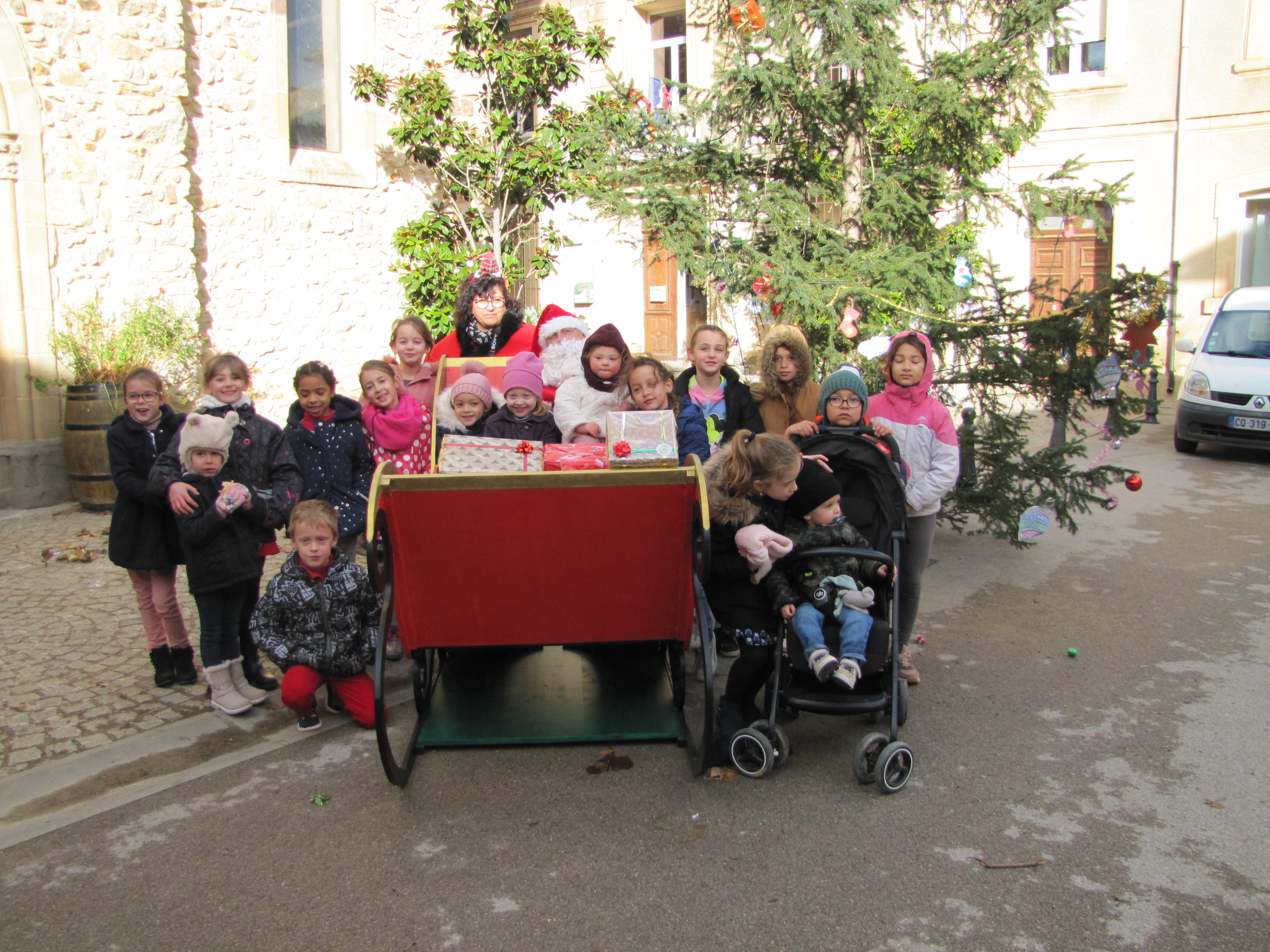 du 22 décembre 2021 Le Père Noël a fait une halte au village Samedi matin entre 10 heures et midi, le Père Noël s'est installé devant la mairie dans le magnifique traineau réalisé par Gisèle et Michel Férrère. Une trentaine d'enfants - petits et plus grands - sont venus rencontrer le vieux Bonhomme à la barbe blanche, histoire de lui rappeler qu'ils avaient été sages et attendaient sa visite avec impatience pour Noël.... Ce dernier a bien noté les désirs et recommandations des enfants! Ils peuvent dormir sur les deux oreilles, il devrait être généreux encore cette année! Un moment immortalisé gratuitement par Nathy pour chaque enfant! Pour les faire patienter, crêpes et boissons leur étaient offertes par le comité des fêtes et la MJC vendait des décorations de Noël. De quoi faire briller des étoiles dans les yeux des enfants!