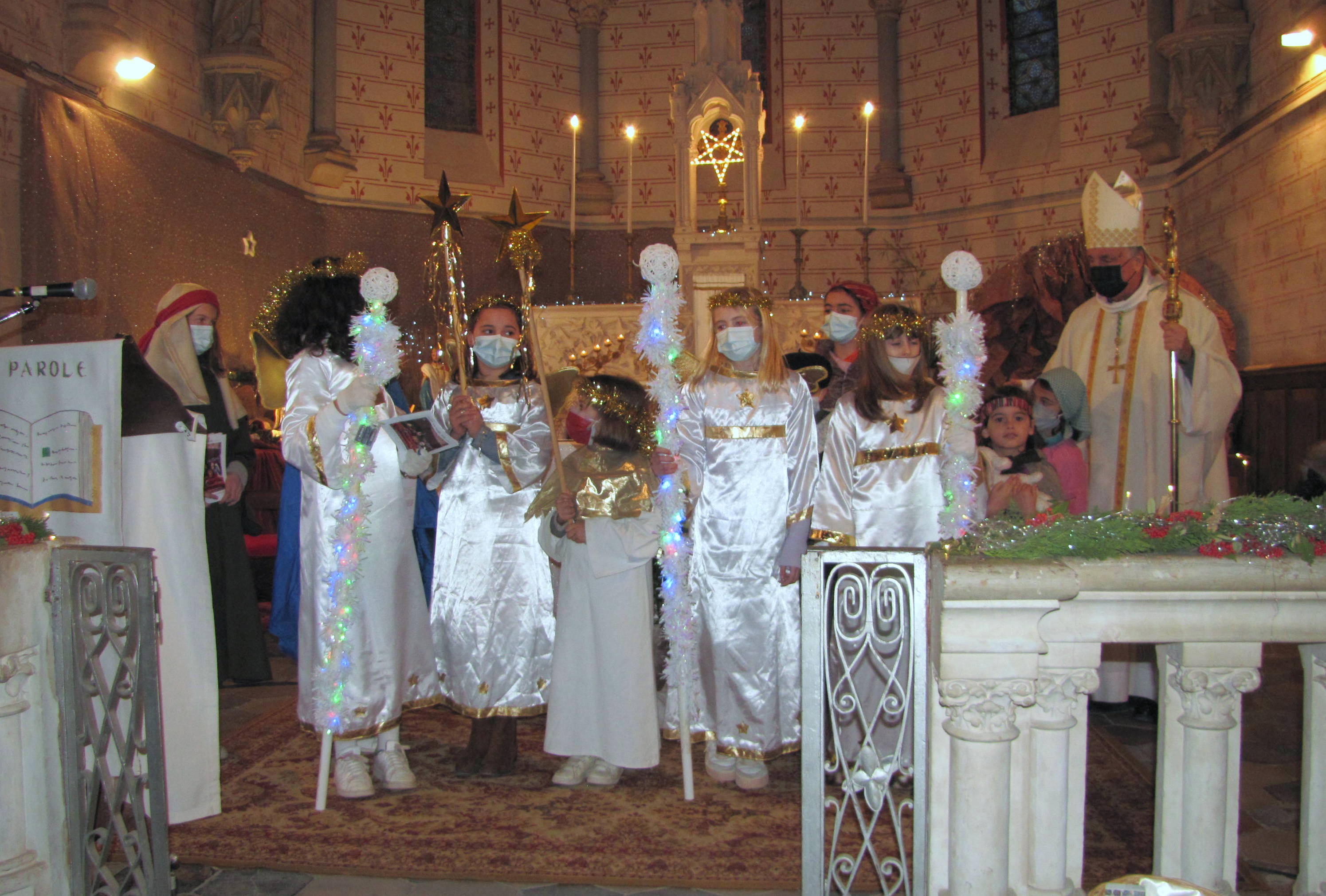 Les enfants qui formaient la crèche vivante ont pris place aux côtés de Mgr Paillet pendant et après la célébration. |