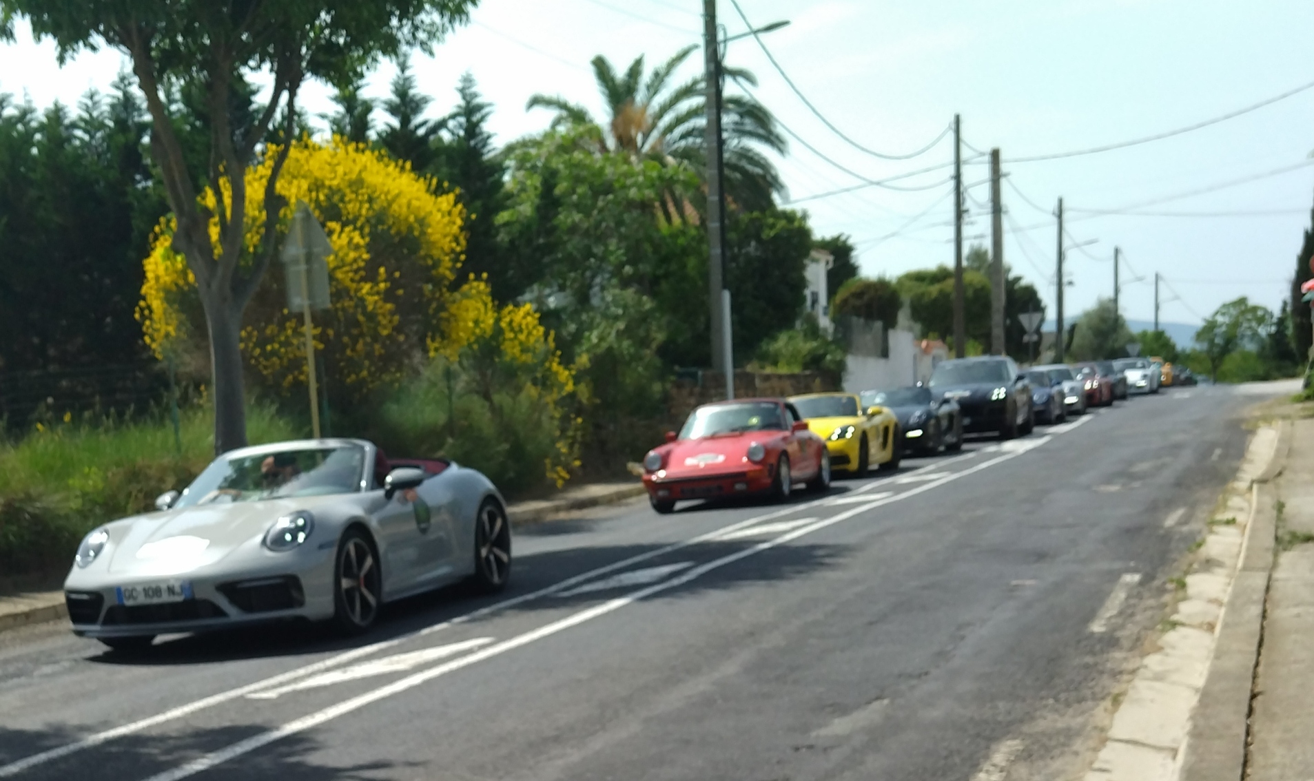 du 07 juin 2022 La Tra'montagne est passée par le village Un véritable défilé de véhicules Porsche a traversé le village ce samedi après-midi... avec un grand respect de la vitesse et du code de la route et même pour le feu comportemental décidé parfois à rester "rouge de plaisir" devant ces belles cylindrées qui roulaient au pas ou presque! Renseignements pris au hasard de quelques conducteurs ... il s'agissait de la 6ème édition de la Tra'montagne, une concentration de Porsche qui a lieu à Saint Cyprien avec rallye touristique passant par le Narbonnais, le Minervois et les Corbières samedi et épreuve de régularité dimanche sur un autre circuit. Ce fut une belle surprise pour les Thézanais qui habitent avenues de la gare et de la mer de pouvoir admirer près de 150 voitures toutes plus rutilantes et les unes que les autres!