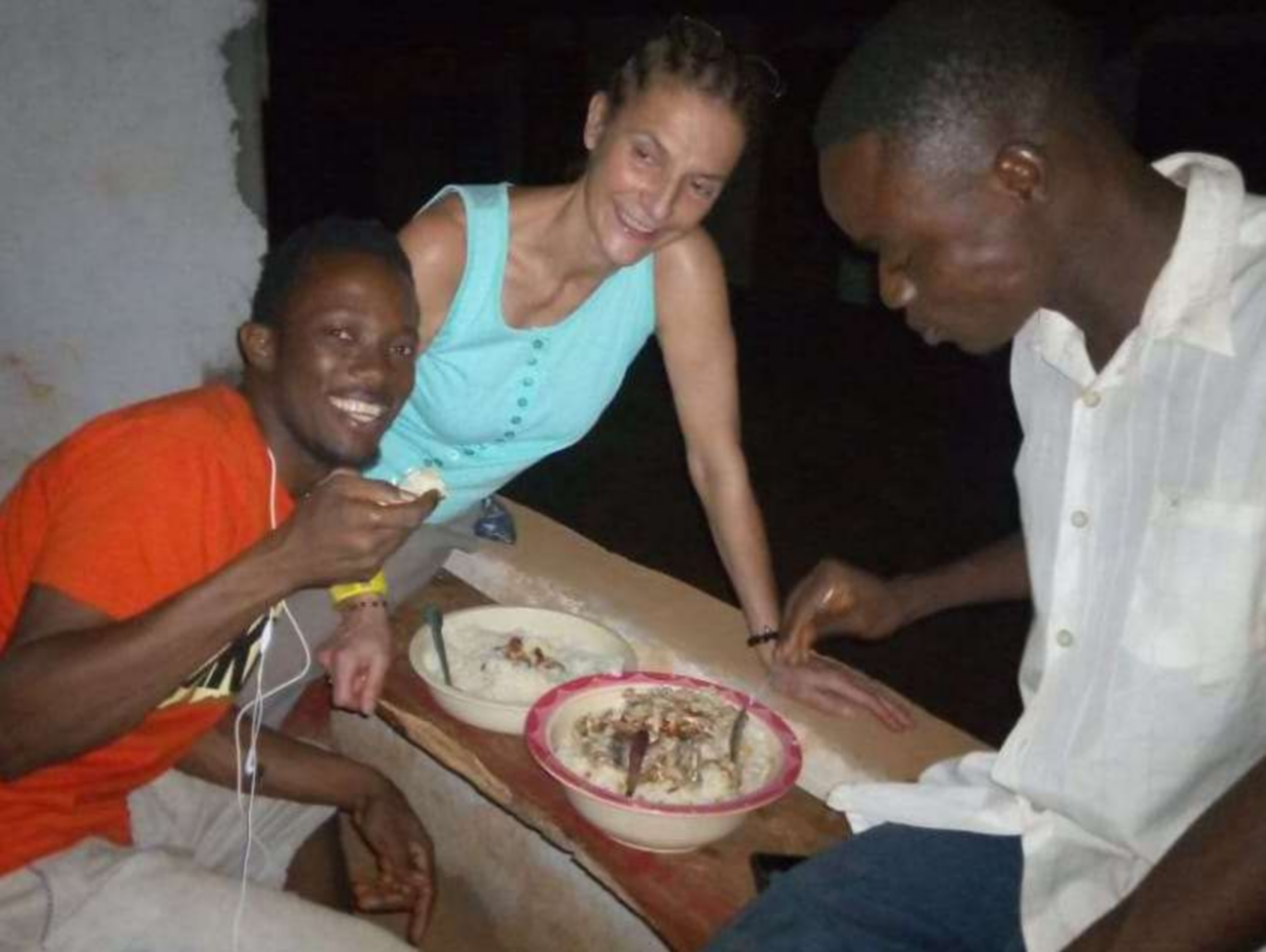 Nathalie Dubois en compagnie de Joseph et Foday, les instituteurs qui assurent le suivi des jeunes.