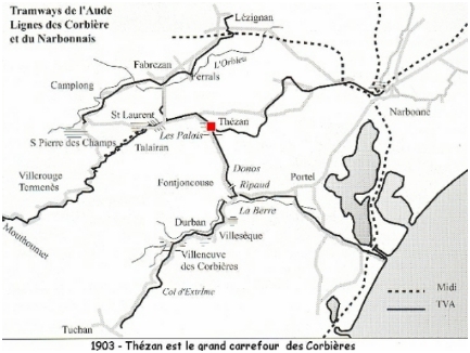 Le temps à passé, il n'est déjà plus question de désenclaver grâce au progrès de la science les petits villages de la Corbière, mais avant tout d' être rentable, et à ce jeu c'est la route qui va gagner la bataille du rail. Si au début du siècle le chemin de fer avait largement utilisé le réseau des routes existantes et des rues de villages, ce qui lui valut le nom américain de tramway, dès 1920 on goudronne les routes et les rails par la même occasion, ce qui permet aux camions et aux autobus d'emprunter de plus en plus les voies des trains. En 1932, la société TVA ( Compagnie de Tramways à Vapeur du Département de l' Aude ), lâchée par ses garants Conseil Général et Chambres de Commerce, déposa le bilan, les employés et les rails. mais personne ne retrouva trace des 100.000 traverses en bois du réseau... Si le temps a passé, la nostalgie du petit tram est restée vive dans la mémoire des anciens. Qui sait si un jour on ne verra pas renaître sur un tronçon des Corbières, un petit train touristique témoin d' une grande époque de notre région ???...