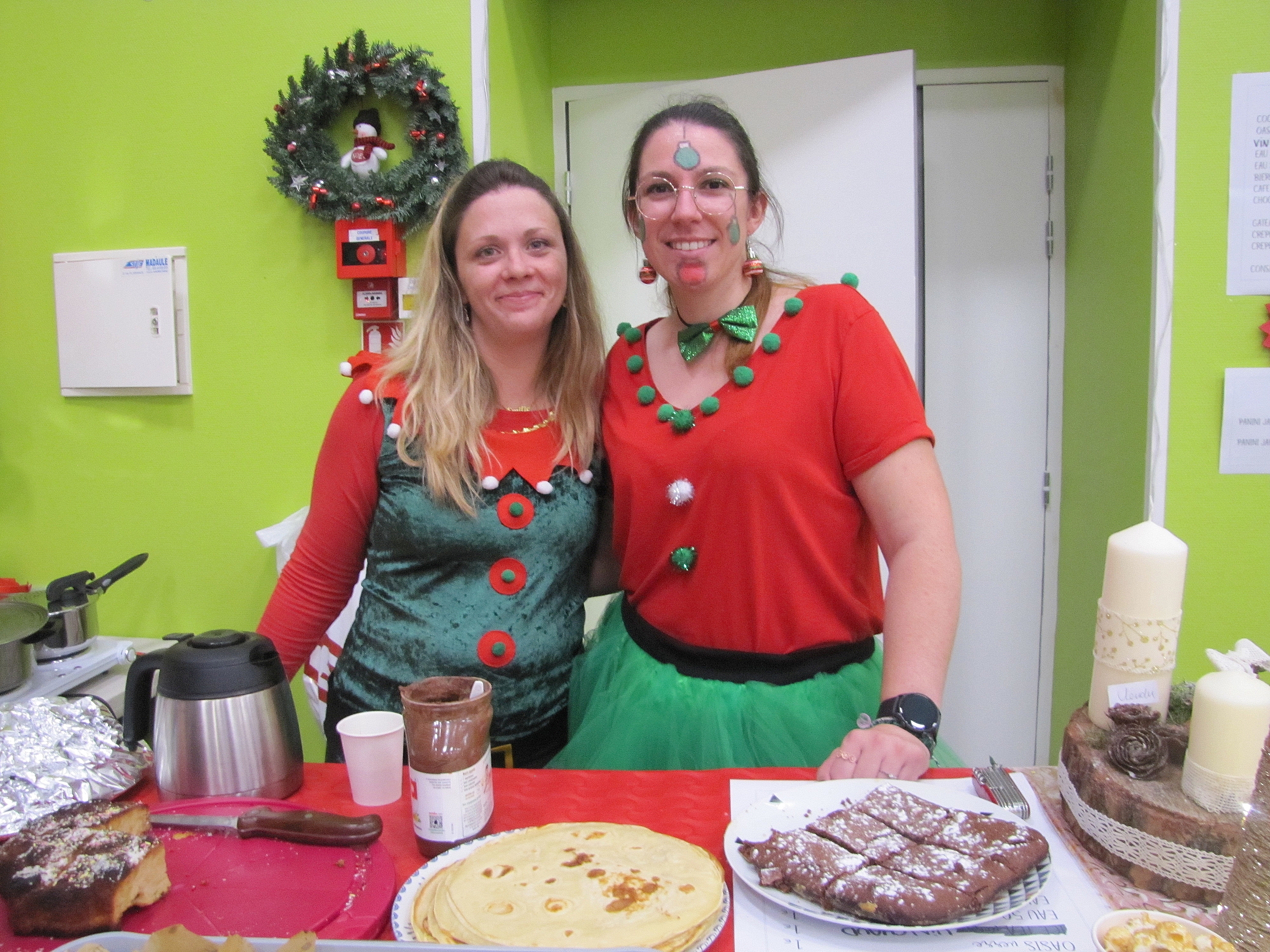 Émilie et Camille assuraient le service restauration et la vente des biscuits fabriqués par les élèves et les décorations faites par les mamans. |