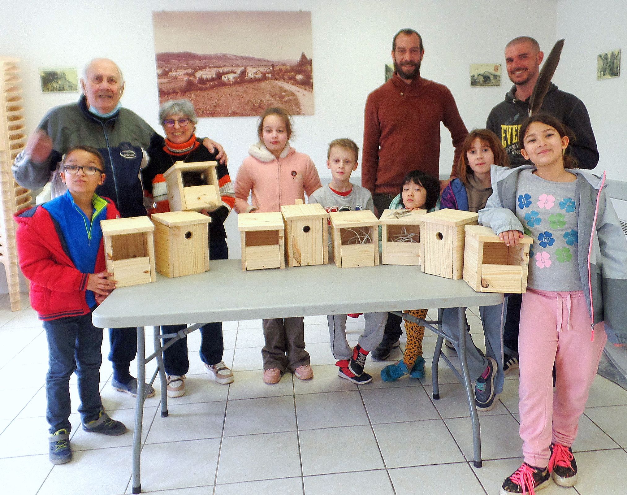 Les enfants et quelques-uns des adultes présents sont fiers de présenter leurs nichoirs et de participer ainsi à la protection de l’environnement. |