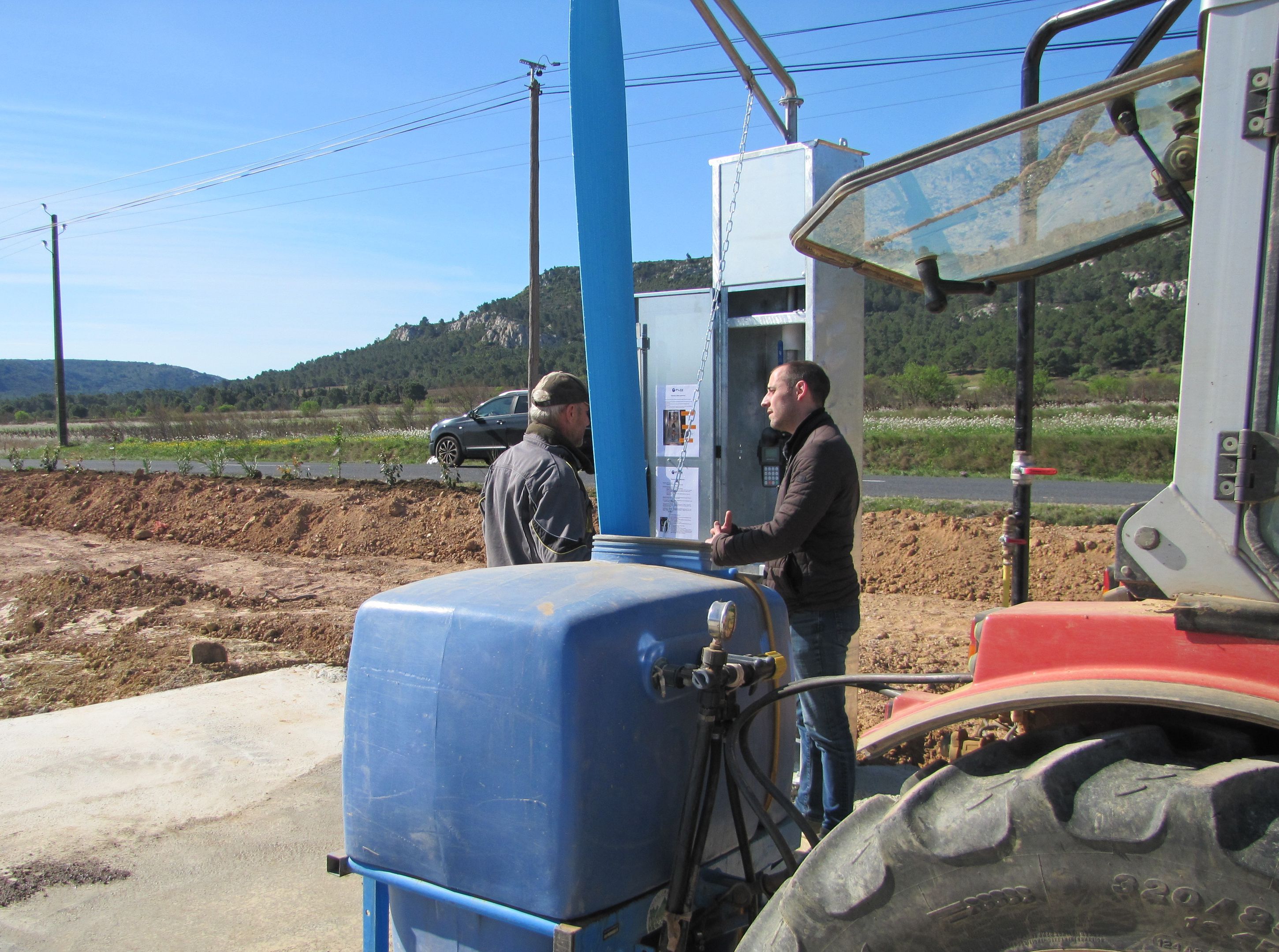 Premiers essais de la nouvelle colonne de remplissage des pulvérisateurs et citernes des agriculteurs locaux en compagnie de Jean-Philippe Fischer, adjoint chargé des finances. |