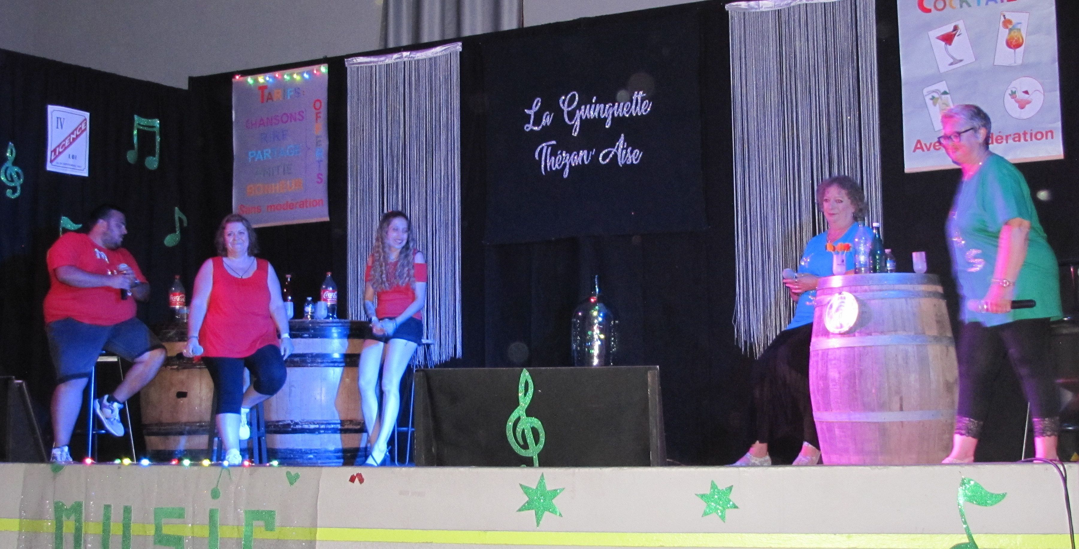 du 07 juillet 2023 la guinguette thézan’aise, un show tendre et pétillant Dans un magnifique décor réalisé par Nadine Llop, membre de la troupe du Music-hall show depuis toujours, les artistes ont brillé comme les lettres scintillantes annonçant La guinguette thézan’aise. Sur fond de tonneaux et de tables dressées, les cinq artistes se sont succédé sur scène envoyant émotion, tendresse et humour aux spectateurs qui répondaient avec enthousiasme aux diverses chansons préparées pendant toute la saison. Que ce soit Valérie, animée par cette passion de chanter, jouer la comédie et transmettre ses ressentis et émotions depuis des lustres, Gisèle, nouvelle recrue qui a ravi le public avec ses chansons d’hier remplies de souvenirs, Chloé, pétillante d’énergie, autant à l’aise dans ses chansons pleines de tendresse que dans les rythmes effrénés, Maxime et sa voix chaude et profonde, Sandrine très à l’aise sur scène avec un bel hommage à Jean-Jacques Goldman dans un medley commun, la guinguette thézan’aise a passé en revue les chansons de variété de tous les temps et répondu aux attentes du public. Les applaudissements ont été la récompense méritée à ce spectacle bien ficelé où l’on n’a pas vu le temps passer. Les rappels en fin de soirée n’ont pu que convaincre la troupe de poursuivre sa route et se retrouver non pas dans dix ans comme la chanson fétiche de la soirée mais en 2024. Rendez-vous est pris.