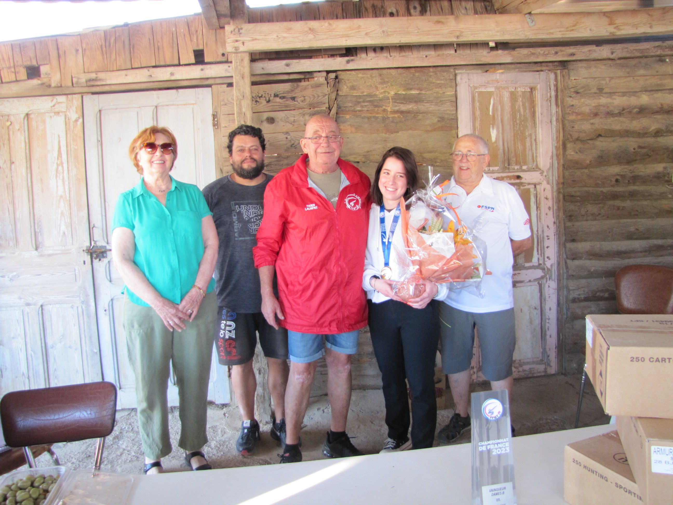 du 14 aout 2023 Clémence de Thézan-des-Corbières, championne de France de ball-trap Laurent Laffon est un président heureux. Une des deux féminines du Ball-trap club thézanais est devenue championne de France DPL (Down the line) lors des championnats nationaux qui se déroulaient à Lazenay, dans le Cher, fin juillet. Pendant quatre jours, Clémence Brinet-Manquat a passé les diverses étapes qui lui ont permis d’obtenir 544 points sur 600. Ce titre lui fait plaisir mais il fait aussi la fierté de la grande famille du ball-trap thézanais. À 21 ans, Clémence est une habituée des compétitions puisqu’avec son ancien club en Haute-Savoie, elle avait été vice-championne de France junior en féminines. " Toutes nos félicitations. Le comité est fier de tes résultats et compte sur toi pour continuer à mettre ton club à l’honneur ", a commenté Edwige Villot, vice-présidente de la Fédération Occitanie et présidente de la Fédération départementale de ball-trap, en lui remettant des boîtes de cartouches lors de l’apéritif offert pour l’occasion. Des cartouches Le club avait également participé à sa manière aux frais financiers que demandent ces championnats de France en lui offrant des cartouches. Laurent Tixier, arbitre national, a eu l’honneur de remettre un superbe bouquet à la jeune championne de France. " C’est exceptionnel de voir une championne de France dans un petit club. Nous sommes tous fiers de ce titre ", a ajouté Laurent Laffon, qui est lui aussi un habitué des compétitions de haut niveau, mais il a levé le pied cette année pour se consacrer à son nouveau titre privilégié, celui de papa d’une petite Léonie qui suivra sans doute ses pas. Du moins, l’espère-t-il !