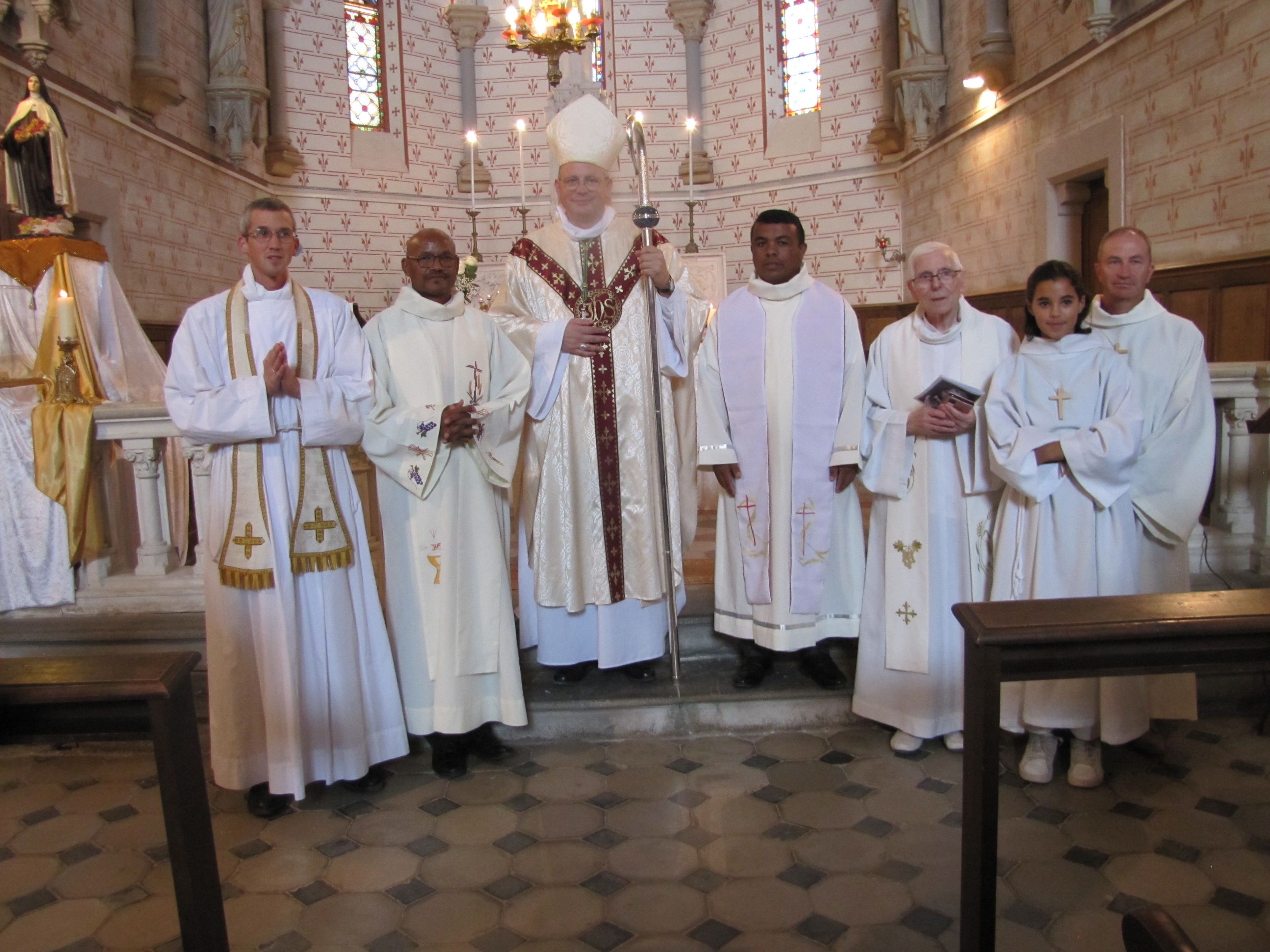 À l’issue de la célébration, Mgr Valentin, entouré des pères Julien et Alain, du père Louis et de ceux qui ont célébré l’office. |