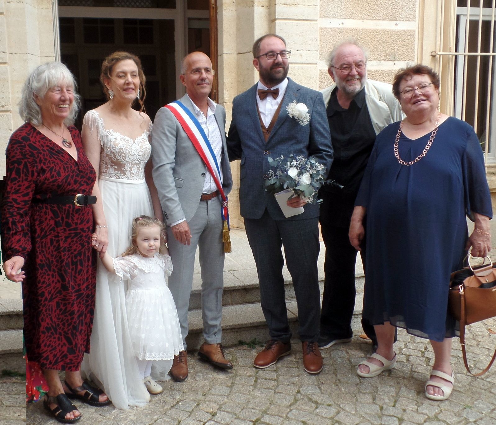 du 12 octobre 2023 un mariage peu ordinaire Parfois il suffit de quelques mots… Daniel Wenisch et Élisabeth Mühlbauer sont Allemands et travaillent dans la même entreprise en Allemagne. Il y a cinq ans, Élisabeth, a des soucis avec son ordinateur. Daniel, informaticien, arrive au secours de sa collègue et le remet très vite en fonction. "Merci", lui dit-elle très naturellement en français. "De rien", répond de la même façon Daniel. Ce petit échange dans la langue de Molière, improbable dans une entreprise allemande, a déclenché l’étincelle qui aboutit à une belle histoire d’amour de ces deux amoureux de la France. Après des fiançailles très romantiques en duo au cœur d’un champ de lavande à Murs dans le Lubéron, c’est à Thézan qu’ils ont choisi d’unir leurs destinées "parce qu’ils n’imaginaient pas se marier ailleurs qu’en France". Le fait que Elfi et Uli Wenisch, les parents de Daniel, résident dans le village depuis 2007 a facilité les choses. Ce mardi 3 octobre, ils ont échangé leurs consentements devant le maire Philippe Puech et leurs familles et avec pour principal témoin leur fille Hanna, 2 ans 1/2. "Merci d’avoir choisi notre village pour votre mariage, c’est une première dans la commune" a souligné le maire avant de procéder au mariage civil. À la sortie de la mairie, et il ne pouvait en être autrement, les jeunes époux sont sortis sous une pluie de graines de lavande !