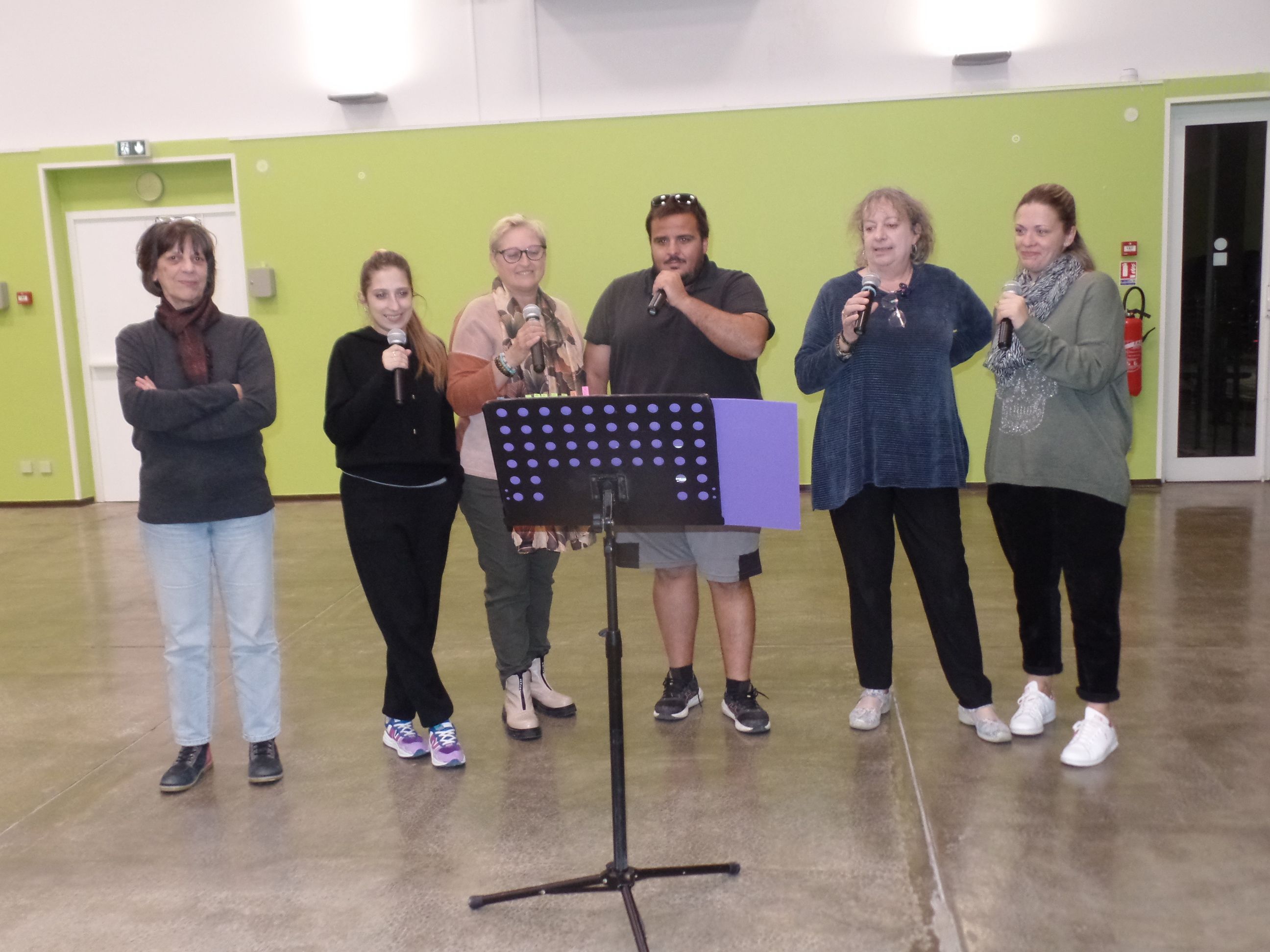 du 31 octobre 2023 Les jeudis, en chantant La troupe du Music-hall show a repris les répétitions chaque jeudi soir au foyer. Cette saison accueille sept chanteuses et chanteur ; Valérie, la présidente qui mène le groupe "à la baguette" ainsi que Carine, Chloé, Gisou, Maxime, Émilie et Emma accompagnés par le staff composé d’Henri, Claudine, Aurore et Nadine. Tous se sont d’ores et déjà mis au travail pour préparer le spectacle qui aura lieu le 29 juin 2024 sur le thème Le MHS fait ses emplettes aux "Halles thézan’Aises". Les soirées hebdomadaires se déroulent donc en chansons mais pas que… des sketches s’invitent aussi pour donner un aperçu multifacettes de la troupe qui travaille sérieusement mais dans une ambiance détendue et conviviale.