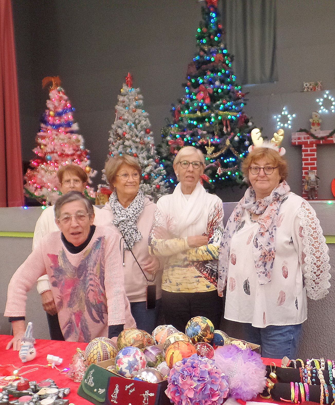 Devant la scène où trônaient une multitude de sapins illuminés, la MJC proposait les décorations de Noël fabriquées aux ateliers créatifs. |