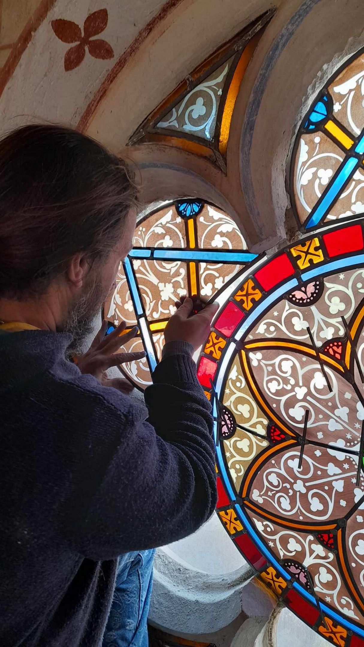 Vincent Gallegno a restauré et remis à leur place les trois rosaces du chœur endommagées par les années et les intempéries. Un travail méticuleux et précis. |