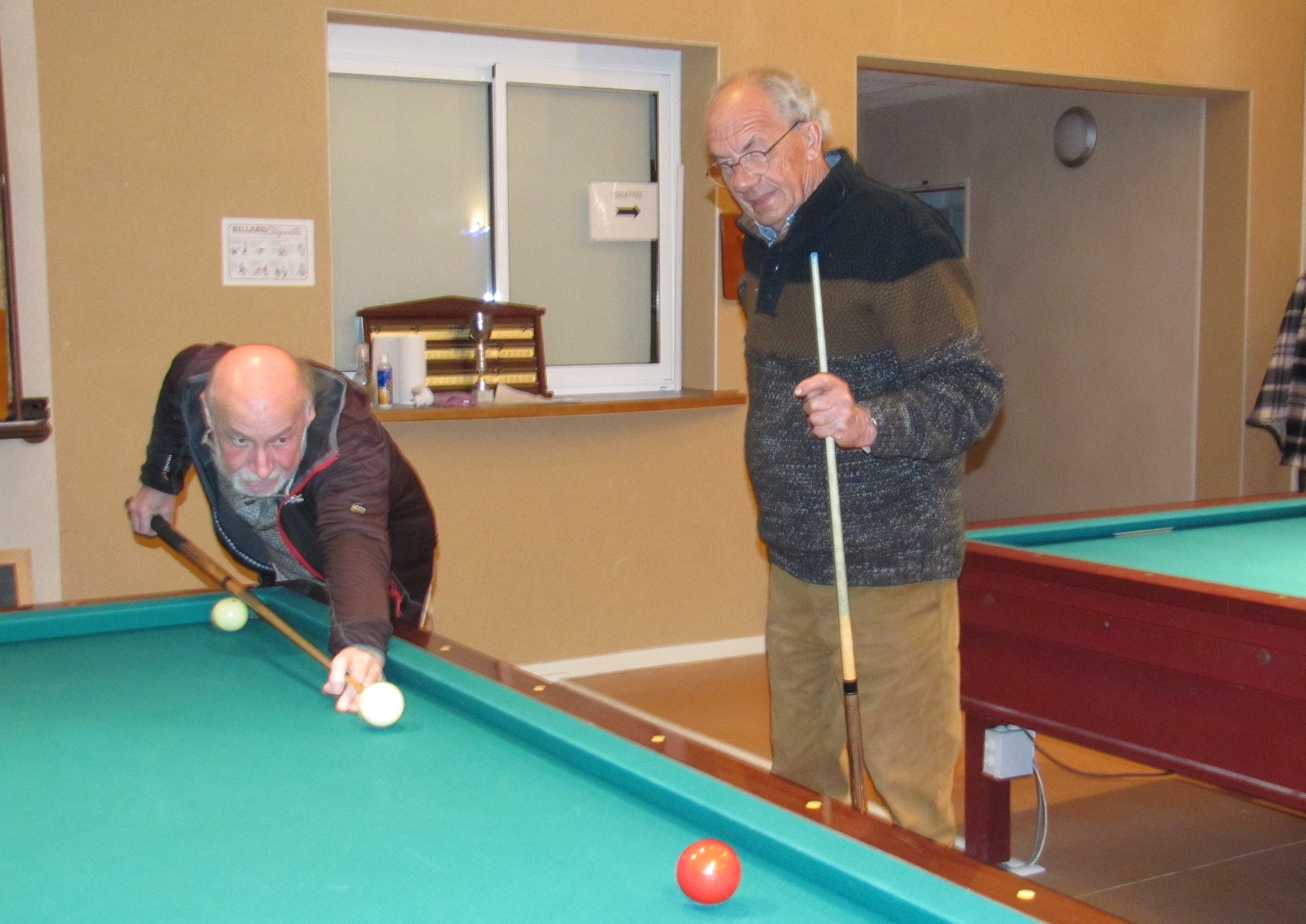 Pierre Troupel (à droite), nouveau président et formateur du club et de la Fédération initie Patrick au billard carambole. Il y a 3 billards et des joueurs avertis pour débuter ou se perfectionner à ce sport. |