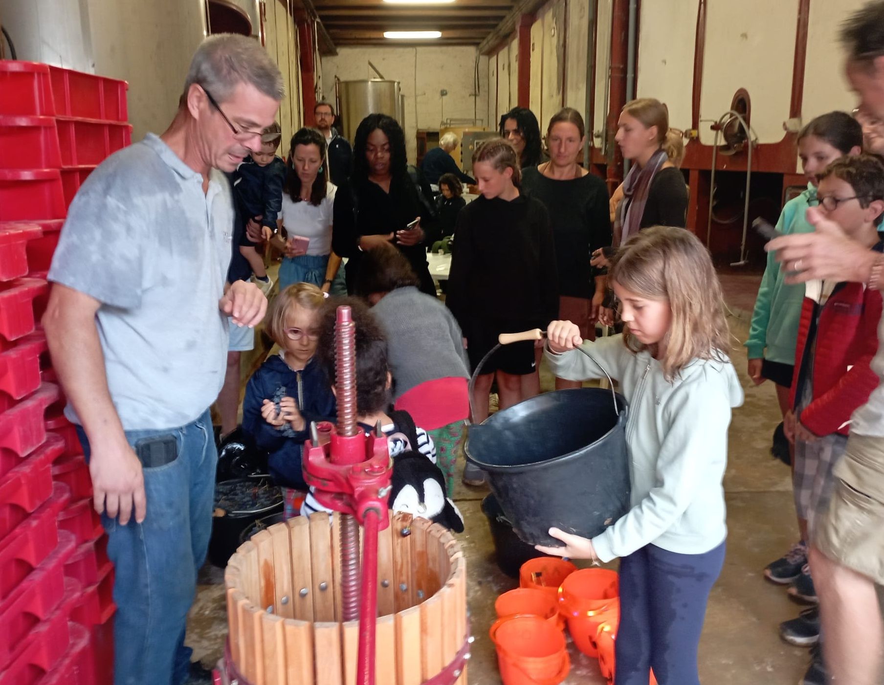 À deux reprises, les enfants sont allés cueillir leur grappe de raisin et ont mis dans le pressoir le fruit de leur récolte pour en déguster le jus pressé. |