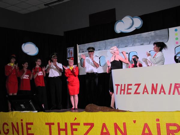 «La compagnie Thézan'Air est heureuse de vous accueillir à bord de ce vol en direction de Moscou avec escales et détours... Le commandant de bord, les pilotes et le personnel vous souhaitent un moment de bonheur, de rires et de chansons loin des turbulences de la vie! Bon vol et bon spectacle à tous les passagers!». C'est en résumé ce que pourrait annoncer l'équipage du Music Hall Show pour son nouveau spectacle conçu et mis en scène par la présidente Valérie et Aude, membre de la troupe qui n'ont pas tari d'imagination pour transporter leur public dans une représentation gaie et colorée, empreinte de chansons et d'humour...