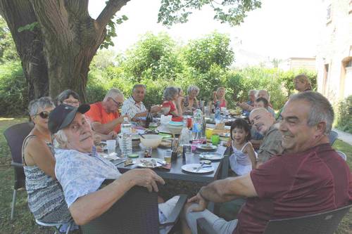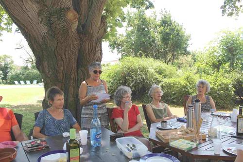 Au Sud des nuages: fin de saison conviviale Malgré une saison perturbée, l’association «Au Sud des Nuages» animée par Lilan Peng a tenu à fêter la fin de l’année par une rencontre amicale et intime entre les membres disponibles des différents ateliers. Une vingtaine de personnes s'est retrouvée ce lundi autour d'un repas partagé - type «auberge espagnole» - qui avait lieu chez le Anne Simon, membre et intervenante de l'association. La journée a été l’occasion d’échanges divers entre les différentes personnes qui ne fréquentent pas les mêmes ateliers: calligraphie, Qi Gong, soins bien-être, rencontre dégustation de thé etc... Cette réunion en toute simplicité a permis de mieux se connaître les uns les autres et de s’apprécier différemment en dehors des activités. Vers 16 h, Lilan a fait déguster un thé de 8 ans d’âge - huit immortels - ramené d’un de ses voyages en Chine où elle avait rencontré le producteur. Pendant la dégustation de ce thé au goût subtil, Françoise a chanté «L’eau vive», chanson crée par Guy Béart pour le film Manon des Sources. Les personnes présentes, membres et leur conjoint ont apprécié cet agréable après-midi passé à l’ombre du majestueux tilleul. Puis chacun est reparti, enchanté de cette journée en attendant la reprise des activités en septembre. Un grand merci à Anne et son époux pour leur accueil chaleureux.