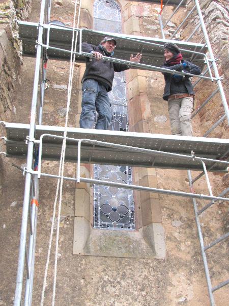 Prévue et attendue, la restauration des vitraux de l'église Ste Eulalie a débuté. Deux des trois vitraux du chœur sont en cours de rénovation. Ces travaux sont réalisés par la SARL «En verre et contre tout», maîtres verriers à Castres. Le vitrail voué à St Paul vient d'être réinstallé après plus de d'un mois consacré à sa restauration: dépose et dépicage de quatre des sept panneaux du vitrail, nettoyage, remplacement de 18 pièces de verre par des nouvelles à l'identique, remise en plomb à neuf de deux panneaux, soudure, pose d'attaches neuves en laiton, masticage... Les travaux sont réalisés avec un rare savoir-faire doublé d'une grande minutie. Pour réinstaller le vitrail à sa place, le duo de maîtres verriers travaillent à près de huit mètres de hauteur à l'extérieur comme à l'intérieur. Ce premier vitrail reposé, il reste à en terminer le calfeutrement à la chaux d'ici quelques semaines. Dans la foulée, le second vitrail dédié à St Pierre a été déposé à son tour pour subir pendant près d'un mois un lifting complet et il devrait être remis en place pour la célébration de la messe de Noël. Les Amis thézanais du patrimoine sont fiers et ravis que leur projet prenne enfin forme. Le coût de cette première tranche de travaux est de 4 920 € a été financés en totalité par l'association, grâce aux bénéfices réalisés lors des manifestations organisées chaque année. «Ces vitraux, c'est un peu chacune des personnes qui ont participé à nos animations» confiait Nicole Garras, secrétaire de l'association.