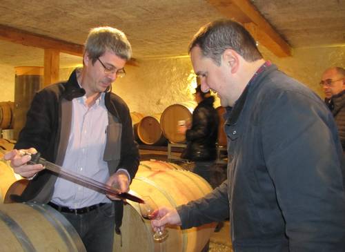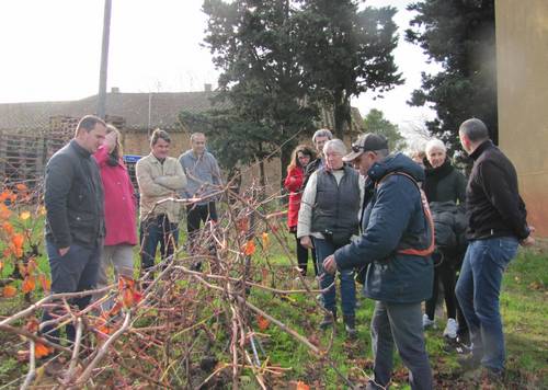 Dans le cadre de la 1ère ronde du cru Boutenac, le château St-Estève a ouvert ses portes au public Plusieurs animations étaient organisées dont un atelier taille au cœur des vignes qui a surpris et ravi les participants. Marcel Cardace, chef de culture au domaine a expliqué, démontré, répondu avec précision aux questions posées sur le cheminement de la taille. Un travail qui ne consiste pas uniquement à couper et laisser faire mais à équilibrer la souche, guider les jeunes sarments en espalier, ôter des bourgeons afin d’assurer la qualité plutôt que la quantité… Il a expliqué la réduction des traitements grâce aux « diffuseurs de confusion sexuelle ». « De plus en plus de vignerons utilisent cette méthode contraignante mais efficace dont la pose se renouvelle chaque année » a-t-il expliqué. Chacun a pu constater le travail précis et très coordonné que demandent des vins de qualité. Dans le caveau, David Latham assurait l’atelier dégustation « verticale » du Ganymède, la cuvée phare du domaine, des premières bouteilles datant de 2006 au millésime 2017. Les participants ont visité le chai à barriques où sont alignés plus de 80 tonneaux contenant les divers cépages de la récolte 2018 pour les assemblages des diverses cuvées. Dans le caveau également, les visiteurs ont pu apprécié les œuvres d’Isabelle Fihey, des toiles sombres ou lumineuses, en fonction des couleurs de sa vie. Et le midi, chacun a pu découvrir le menu servi par « Entre mets et camion », un food-truck dont la charmante propriétaire ne cuisine que des produits frais et locaux. Cette première édition a pleinement satisfait tous ceux qui souhaitaient connaître davantage les secrets des vins du domaine Saint-Estève.