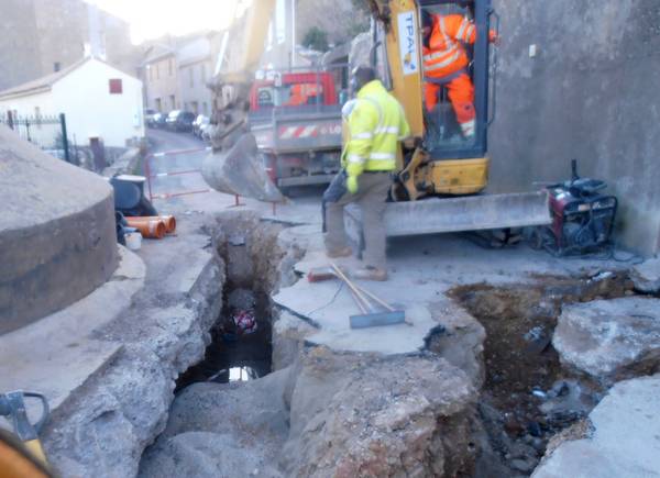 L'entreprise SRI travaille au remplacement de la canalisation principale d'égout ainsi que des dérivations au habitations avec pose de tabourets neufs. Dans le même temps, elle procède au remplacement des branchements en plomb et des compteurs avec vanne d'arrêt. En début de chantier, l'entreprise a du effectuer le changement non prévu d'un té et d'une vanne de réseau avec canalisation, cheminée et protection pour en permettre l'accès. Celle-ci était en effet hors service découverte sans cheminée et impossible à manoeuvrer.