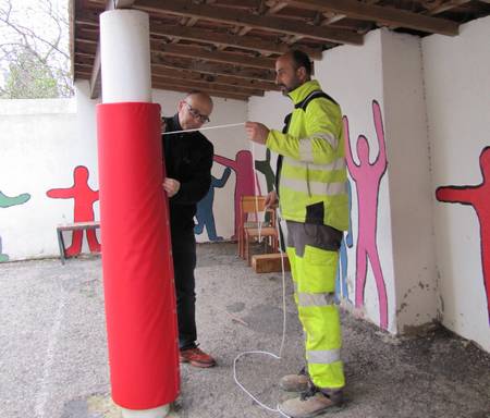 | Sécurité et mise en conformité sont au coeur des travaux effectués par les agents des services techniques ces dernières semaines. À l’école tout d’abord où les élèves de maternelle grande section et cours préparatoire ont retrouvé une cour sécurisée avec la pose de coussins de protection sur les deux piliers du préau. Malgré leur forme ronde, Sébastien Gilabert, agent de maîtrise a posé ces protections en mousse avec l’aide de l’adjoint aux travaux Hugues Dautherives. Les enfants peuvent maintenant jouer sans risques. Le projet de ralentissement de la vitesse dans la traversée du village se poursuit également. Des panneaux « cédez le passage » avec marquage au sol ont été installés à l’entrée sud au croisement de l’avenue de la mer et des rues des Aspres et Émile Pouytès. Il en est de même à quelques dizaines de mètres de l’école. La sortie de la place du Languedoc devient prioritaire avec la pose de ces mêmes panneaux dans les deux sens pour inciter les automobilistes à lever le pied au cœur du village. Des travaux d’embellissement ont eu lieu et sont encore en cours dans des bâtiments de la commune. À la salle du boulodrome, les peintures ont été refaites après remise en état des murs et des travaux de mise en conformité ont lieu dans la salle dite « de l’ancien corbillard » qui va devenir prochainement un salon d’esthétique.