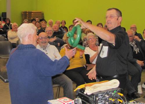 Après-midi des aînés dans la bonne humeur Après les traditionnels vœux aux personnes présentes, le maire Patrick Dapot a laissé la place aux festivités, accompagnant le goûter offert aux soixante ans et plus ! Le choix s’était porté sur le magicien Gérard Bergé « Macarel manches courtes ». Magicien certes mais pas que… Il a enchaîné gags, sketches, sculpture sur ballons, bonnes histoires en occitan, chansons revues, corrigées et reprises en chœur par le public. Gérard Bergé a assuré un spectacle participatif où le public était sollicité en permanence. Une chose est sûre, les zygomatiques ont été soumis à rude épreuve pendant les deux heures de rires et de fous rires qu’a duré la représentation aussi tonique que désopilante ! Si les spectateurs ont apprécié ce moment de détente qui permettait de mettre de côté les soucis quotidiens, le goûter préparé et servi par les élus, le personnel municipal et des bénévoles a permis de déguster quelques gourmandises accompagnées de boissons pétillantes ou non et de reprendre des forces… ne serait-ce que pour revenir dans la soirée à la cérémonie des vœux !
