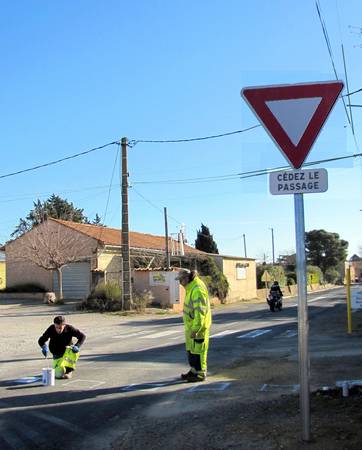 | Sécurité routière: les panneaux de signalisation fleurissent Dans le cadre de la mise en sécurité de la traversée du village, les premiers panneaux de signalisation ont été installés. L'objectif est de faire lever le pied aux conducteurs qui oublient que la traversée d'une commune est limitée en principe à 50 km/h.Les entrées du village sont en première ligne des excès de vitesse, un réel danger pour les piétons qui traversent la D611 ne serait-ce que pour se rendre aux abribus situés place de l'ancienne gare et devant le foyer municipal.Avec l'accord de la Préfecture et sur arrêté municipal, deux "cédez le passage" ont donc été installés par les agents municipaux. La nouvelle signalisation au sol avec panneau se situe à l'intersection de l'avenue de la gare la rue Cassin pour l'entrée nord et à l'intersection de l'avenue de la mer et de la rue Pouytès pour le côté sud. Ce dernier panneau sera d'ailleurs posé sur le mur d'une cave appartenant à Jimmy Bardy avec son autorisation. Il reste à souhaiter que cette nouvelle signalétique soit respectée en attendant les aménagements envisagés pour ralentir la vitesse dans le village!