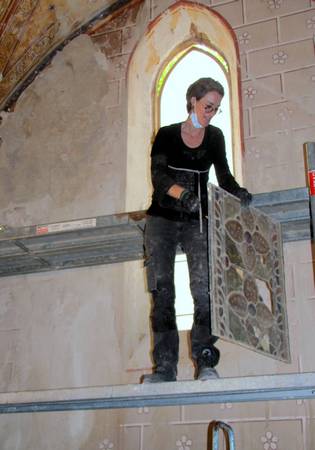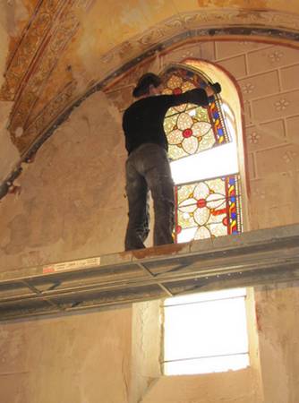 Ce mardi, Sklareen Imbeaud, maître- verrier de la Sarl « En verre contre tout » était de retour dans l'édifice thézanais pour en extraire le vitrail de la chapelle Saint-Roch. Haut de 2,40 m sur 0,70 m de large, une partie de 1,10 m² va être restaurée ou créée. Juchée à plus de six mètres de hauteur, Sklareen Imbeaud a procédé à la dépose de ce vitrail quadrilobes qui a besoin d'un sérieux lifting. Celui-ci a été emmené dans l'atelier de Castres pour y être revu et corrigé. Le maître verrier va dessertir puis nettoyer les verres, repeindre les pièces cassées et peindre celles de la partie créée, actuellement en verre blanc. Elles seront cuites au four à plus de 600° puis serties au plomb et soudées à l'étain.