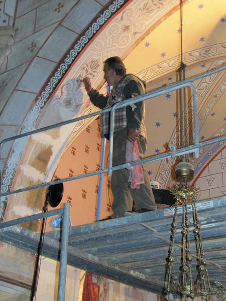 Après la chapelle St Joseph, c'est au tour de la chapelle Ste Germaine de se refaire une beauté. Depuis trois mois, Philippe Bert - Ô plaisir du bois - travaille sur cette nouvelle partie de l'église Ste Eulalie. A grand renfort de patience et de minutie, «armé» d'un pinceau très fin, il refait à l'ancienne tant la couleur des peintures que les dessins, étoiles, fleurs, arabesques. Mais avant de passer à la décoration même, Philippe Bert a refait en totalité le mur de la chapelle très abimé par l'humidité. La restauration sera terminée pour le 11 juin pour les communions de la paroisse Ste Thérèse.