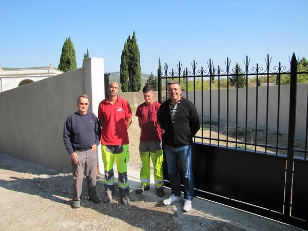 L'agrandssement du cimetière est terminé Il y a deux ans, la commune lançait le projet d’agrandir le cimetière où le nombre de places disponibles était très limité. Décision a été prise en conseil municipal de faire effectuer ces travaux en régie par le personnel communal pour une question de coût - en effet, les devis d’entreprises affichaient entre 30 et 35 000 €. Etudiés de près par le maire Patrick Dapot et l’adjoint aux travaux Daniel Bouniol, ces travaux ont coûté 5 500 € comprenant les matériaux et la pose de deux barrières dont une coulissante pour permettre l’entrée aux véhicules de pompes funèbres. Sébastien Gilabert, agent de maîtrise, Fabrice Montoliu, Philippe Tisseyre et Remi Rouzouls, agents techniques ont travaillé pendant plus d’un an sur son implantation. Les fondations des murs d’enceinte ont été réalisées grâce à la tractopelle acquise en achat mutualisé avecles communes de Tournissan et St Pierre des Champs. L’agrandissement du cimetière est maintenant terminé. Les travaux seront autofinancés par la vente des 55 emplacements qui viennent s’ajouter aux 12 urnes du columbarium et au jardin du souvenir réalisés dans le cimetière neuf il y a un an.