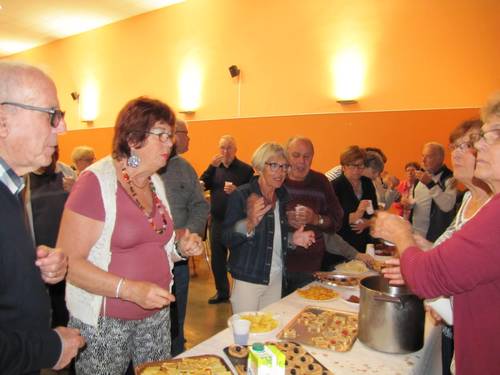 Au retour, un repas était prévu. Après l’apéritif accompagné d’amuse-bouche préparés maison par des membres du bureau, les cinquante convives présents se sont régalés des plats soumis à l’appréciation de leurs papilles et préparés par le traiteur d’Ornaisons. La découverte de la fideua, paëlla à base de pâtes a été concluante!