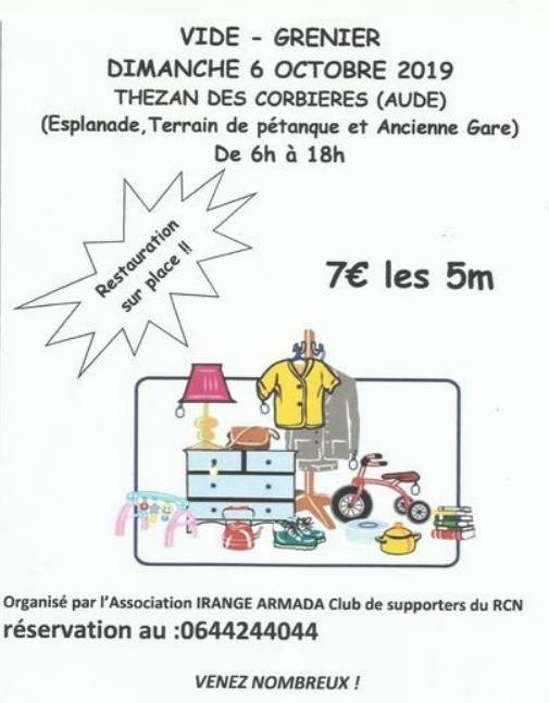 Vide-grenier le 6 octobre L'association Irange Armada, club des supporters du Racing Club Narbonnais organise un vide-grenier dimanche 6 octobre à Thézan de 6 h à 18 h sur la place de l'ancienne gare et le boulodrome. Restauration sur place. Participation: 7 € les 5 mètres. Réservations ouvertes au 06 44 24 40 44