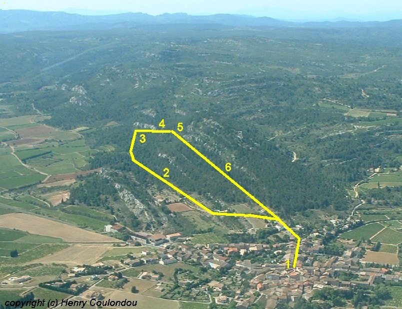 2. En direction du Sud le chemin sans grande difficulté et bien balisé longe à travers la forêt une barre rocheuse. Très belle vue sur les vignobles de la plaine et au loin les châteaux de Montseret, St Martin de Toques et le massif de Fontfroide. |