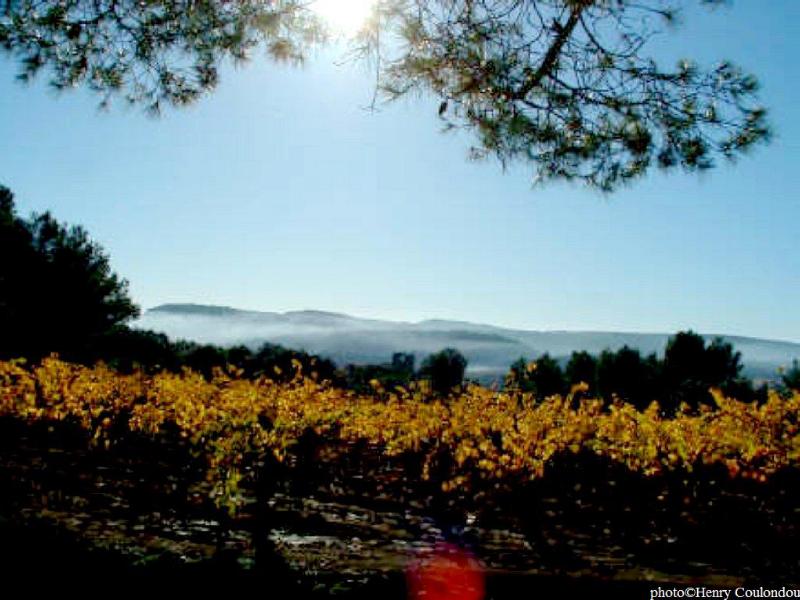 Le vignoble au pied de la pinède, au loin au dessus des brumes le Massif de Poursan.
