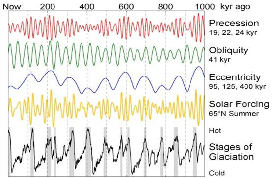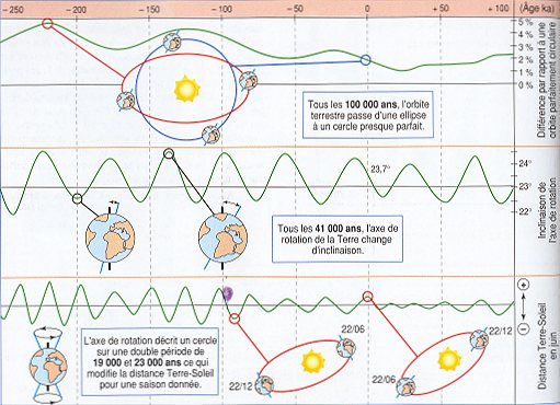 Cycles longs La combinaison de ces 3 paramètres imbriqués est principalement responsable des différents cycles glaciaires et interglaciaires pour un hémisphère donné de notre planète. ( théorie validée sur l.000.000.000 d'années par l'analyse des couches glaciaires aux pôles ( et notamment par le forage Vostok en antarctique ). Actuellement l'orbite de la terre est une ellipse presque circulaire