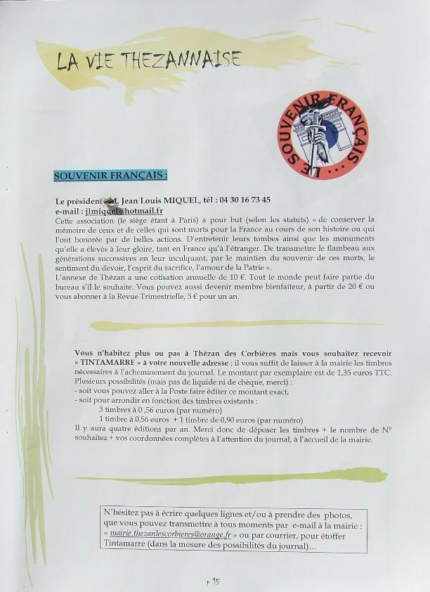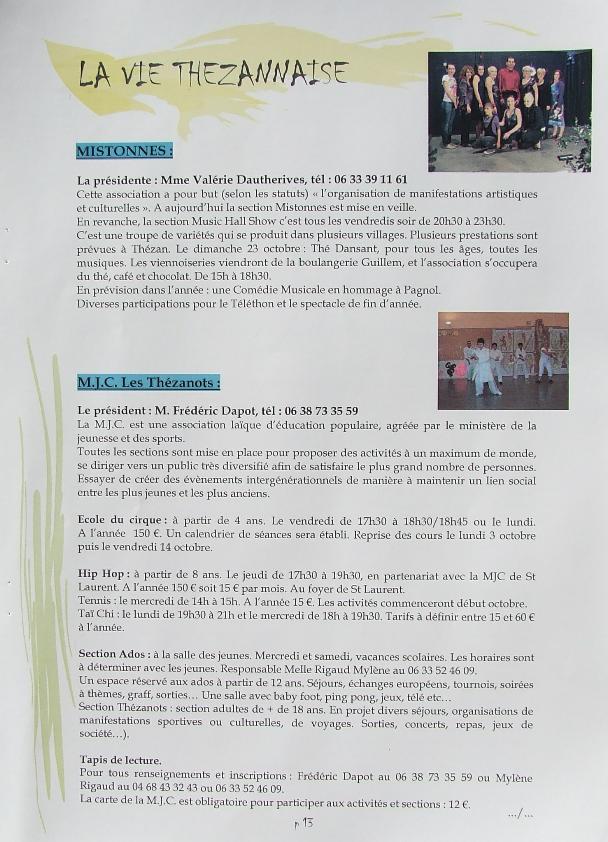 Association MJC - Les Thézanots Carte 15€ /an Responsable Dominique Denarnaud 06 37 15 31 01 - Fred Dapot 04 68 12 14 17 E-mail: mjcthezan@orange.fr - Ving Tsun (Fred) - le lundi 19h45 à 21h15 - 60€ /an - Initiation atelier peinture/dessin (Olivier) - de 14h30 à 16h30 2 merdredis / mois - 80€ /an - Initiation Qi Gong et méditation de pleine conscience - le lundi de 18h à 19h30 - 60€ /an - Ateliers éphémères (cuisine déco fimo ) - un samedi / mois de 14h30 à 17h30 (prix suivant atelier) Détails de la saison 2020/2021 Article de Presse |