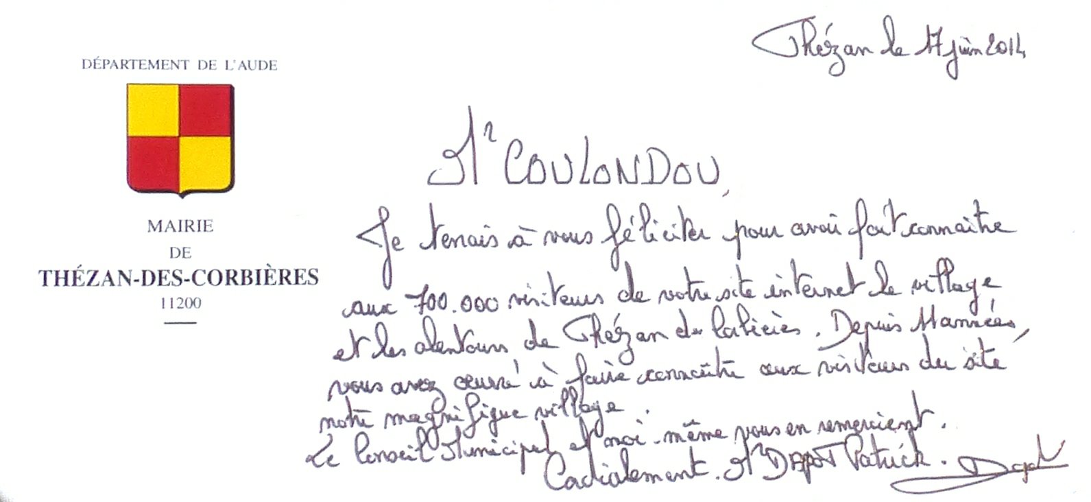 Sujet : merci du Maire d'Albas Visitant par curiosité le site sur Thézan